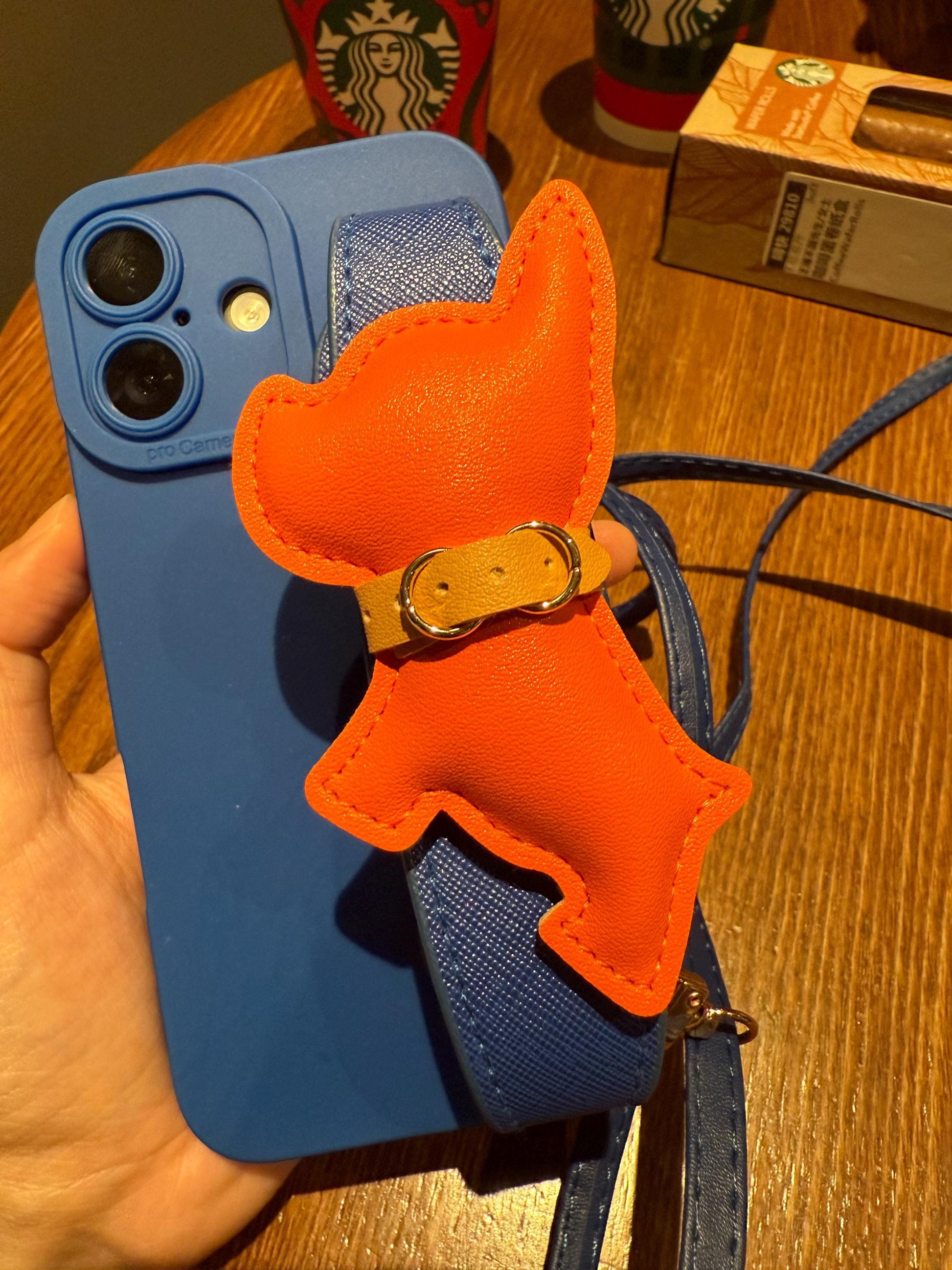 Luxury Orange French Bulldog iPhone 16 Pro Max Case with Wrist Strap. Royal Blue Leather Grip Cover. 3D Puffy Dog Holder. Cute Animal Gift.